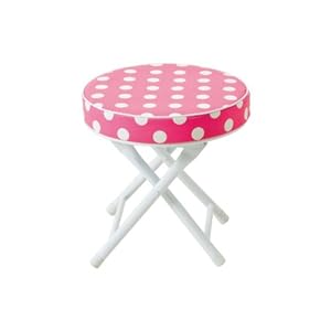 Cushioned folding stool with safety lock. Pink and white polka dotted pattern on PVC seat. White metal base. Great addition to any kid's bed room or playroom. Measures 12 x 12 x 13-inches.